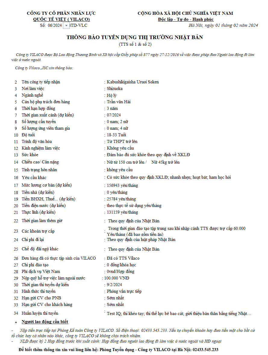 By admin 01/02/2024 No Comments 06/2024 TBTD-VLC: Thông báo tuyển dụng Điều dưỡng viên làm việc tại các Viện Dưỡng lão – Nhật Bản