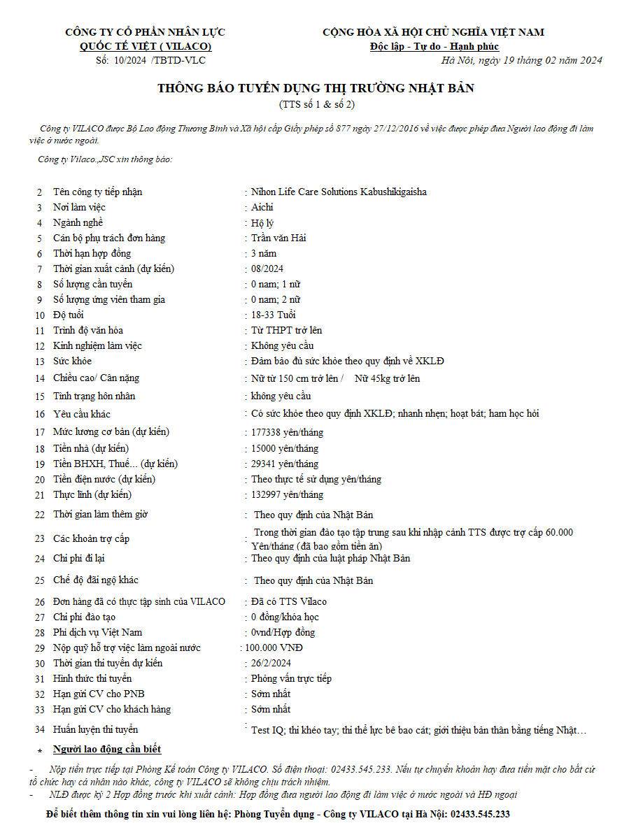 10/2024 TBTD-VLC: Thông báo tuyển dụng Điều dưỡng viên làm việc tại các Viện Dưỡng lão – Nhật Bản